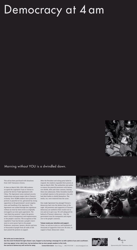這張海報的原由是為了讓全世界知道台灣發生什麼事情,有人在募資平台起了募資活動,希望能夠將台灣目前發生的事情,透過國際媒體發聲來引起關注,而在短短的時間內就募足了資金,買下了紐約時報的全版廣告,而廣告視覺的操刀者,正是台灣知名的設計師聶永真。