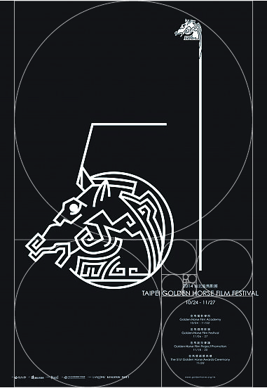 這個作品套上黃金比例的線稿後,就大概可以知道,版面偏寬(與黃金分割矩形相比)、胖會有比較大、氣派的感覺,主視覺往中間稍微集中,視覺重心大概是在頁面的中間下方,有比較有穩重感,而5、1、TAIPEI GOLDEN HORSE FILM FESTIVAL及其下面的說明文字所構成的空白區域,剛好將整個視覺的重心給分散掉。文案主要集中在右下方的圈圈,這在版面的佈局算是蠻常見的方式,但整體來看,依然符合黃金比例的分配方式。所以再次說明,大部份的版面設計絕非偶然或光靠直覺,仍然是有規則可以找尋的!美感就因人而異了。