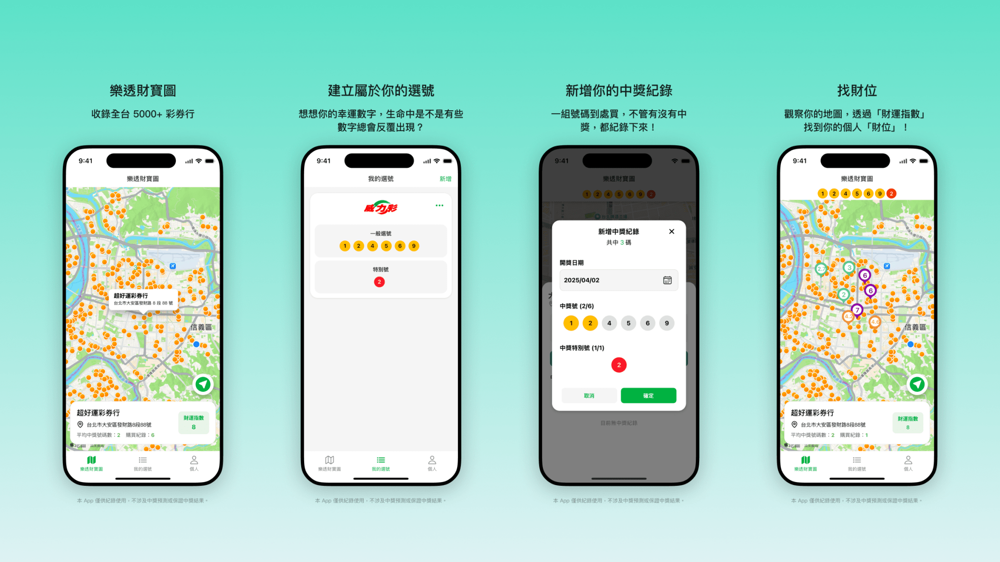 它是一款用來記錄我自己買樂透時中獎記錄的 App。這個概念是某天突然想到的,一開始的想法是:「如果我每次都用同一組號碼,但在不同的彩券行買,會不會有些地方就是比較容易中獎?」,根據我自己的實驗,同一組號碼買了約 30 次,大概平均 4-6 次會中一次 100 塊。慢慢地,我發現自己在台北「大安區」比較容易對中號碼,就開始思考,會不會那個地方是我的財位?或者是大安區就是一個中獎熱點?於是我就想開發一個產品來紀錄這樣的中獎軌跡,也驗證自己的想法。