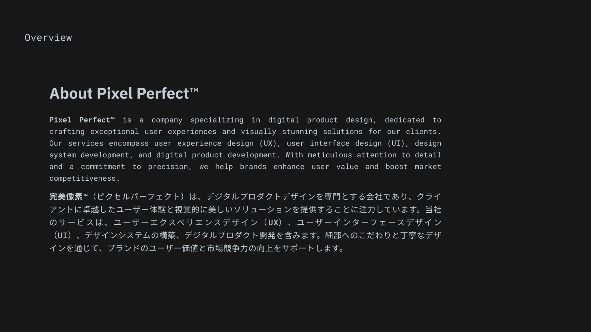 Pixel Perfect™ 是一家專注於數位產品設計的公司,致力於為客戶打造卓越的使用者體驗與具視覺美感的設計解決方案。我們的服務涵蓋使用者體驗設計(UX)、使用者介面設計(UI)、設計系統開發以及數位產品開發。透過對細節的極致講究與對精準的堅持,我們協助品牌提升使用者價值,並在市場中展現更強的競爭力。